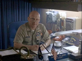 Shortly after Maverick, LT Rick "Hollywood" Neven, LTJG Henry "Wolfman" Ruth, LT Tom "Iceman" Kazansky and LTJG Ron "Slider" Kerner graduate from TOPGUN, he briefs them on the mission which involves a stalled ship, the SS Layton. He is in the radar room as Hollywood and Wolfman are shot down and orders a rescue helicopter to find them and then launches Maverick and LTJG Sam "Merlin" Wells to help Iceman and Slider out.